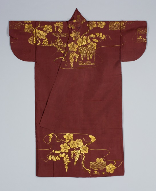■濃紫練緯地葡萄色紙文様摺箔小袖(桃山時代1号)
