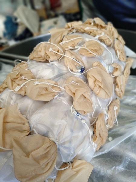 旧衣装の水玉文様もおそらくこの方法で染められたものであり、爆弾染めがいつから始まったのかは定かではないが、旧衣装が制作された昭和初期には確立されていたのだろう、と瀧本さんは仰います。この方法はとにかく集中力と忍耐力が必要とのことで、撮影隊が入ることはできず、誰も作業場に入ってこない休日にひっそりと行われました。染まる間の8秒間の静止は特に緊張したそうです。
