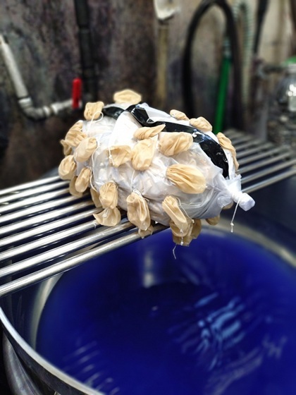 最後に、紅葉文様の背景の黒を染めていきます。黒に染める部分以外はすべてビニールで防染され、ひと塊の状態になっています。