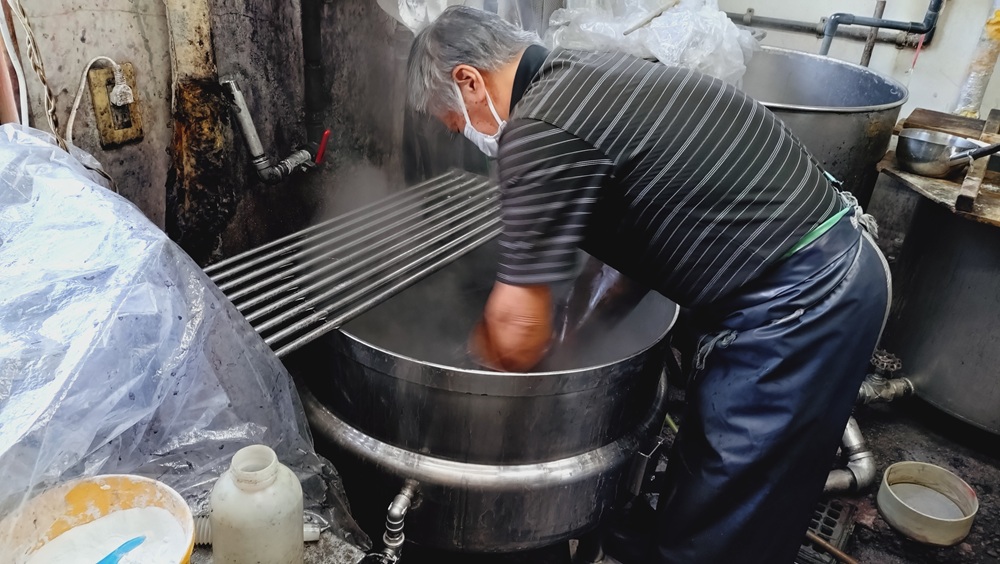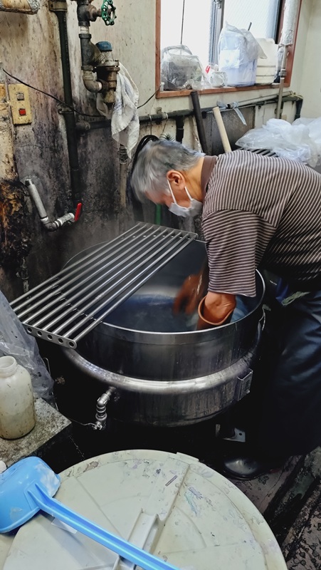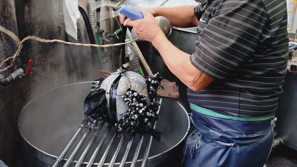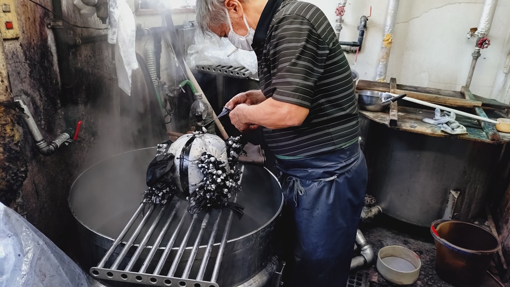 染め方は、水色部分と同様で、染料や助剤を入れて染め、引き上げて色を確認する工程を繰り返しながら、徐々に見本の色に近づけていきます。この日染める黒は、真っ黒ではなく錆色のような黒。この微妙なニュアンスを長年の経験で的確に捉え、何が足りないか、分量はどれくらいかを目測で足していきます。最終的に見本の色に合致するまでの繰り返しの作業は4回。釜の温度上昇に気を配りながら驚くほどぴったり色が合致しました。