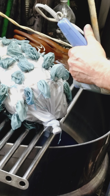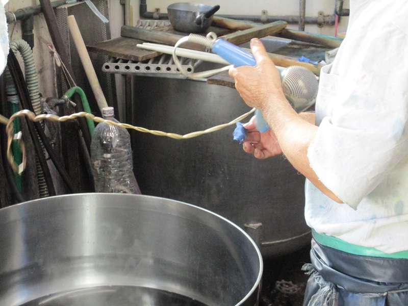 水洗いをして湿らせた生地を染料の入った釜に入れ、均等に色を入れるためにかき混ぜ、引き上げて一部をドライヤーで乾燥させて見本の色と照合ののち、足りない色目を足して再び同じ作業を繰り返します。この日は3回繰り返して色を合わせました。