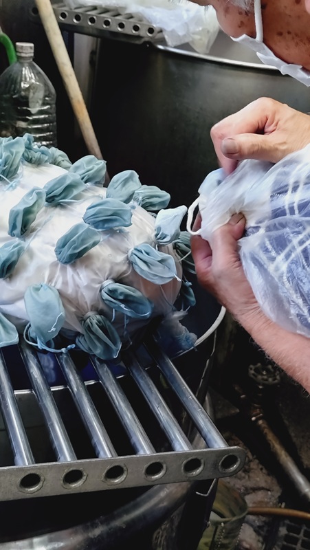 帽子絞りが完成し、次は絞り部分の染めを行います。この作業を行って下さるのは、地染めに引き続き、伝統工芸士の瀧本 勇さんです。