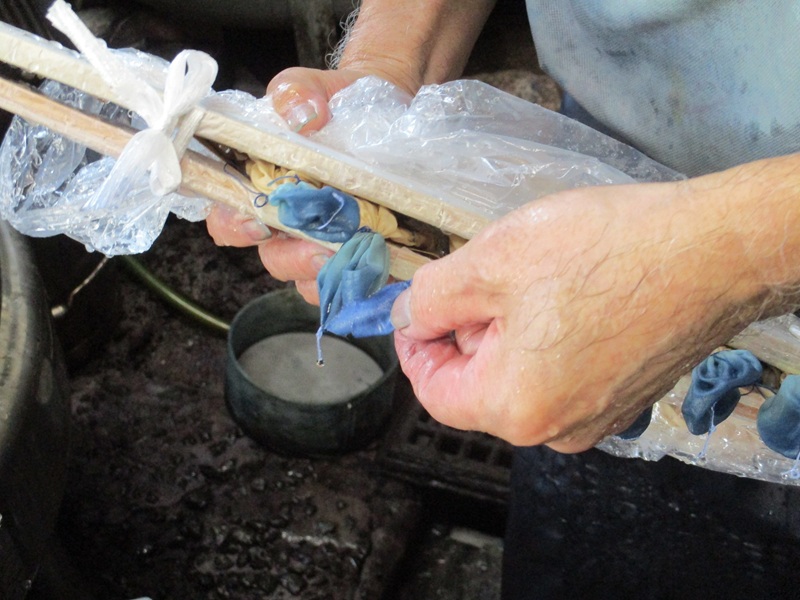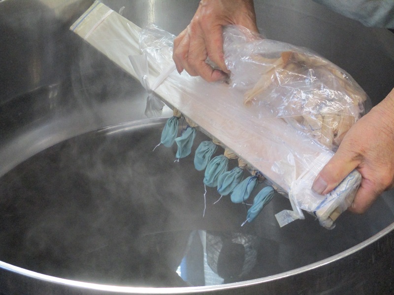 | 釜に入れる | 8秒静止して染料を定着 | 釜から引き上げる |