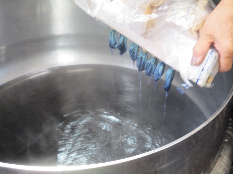 染めの工程は時間との戦いであり、釜の温度や色の定着加減を考えながら、迅速かつ的確に色を合わせていかねばなりません。しかし最初から色を合わせようとして濃い染料液を作ってしまうと、その後色が合わなかったときに直しがきかなくなるため注意が必要です。様々な制限の中で、瞬時に色を分析する目と長年の経験則を活かし、ぴったりと見本の色に合わせるところは見事としか言いようがありません。伝統工芸士の技を目の当たりにし、思わず拍手を送りました。