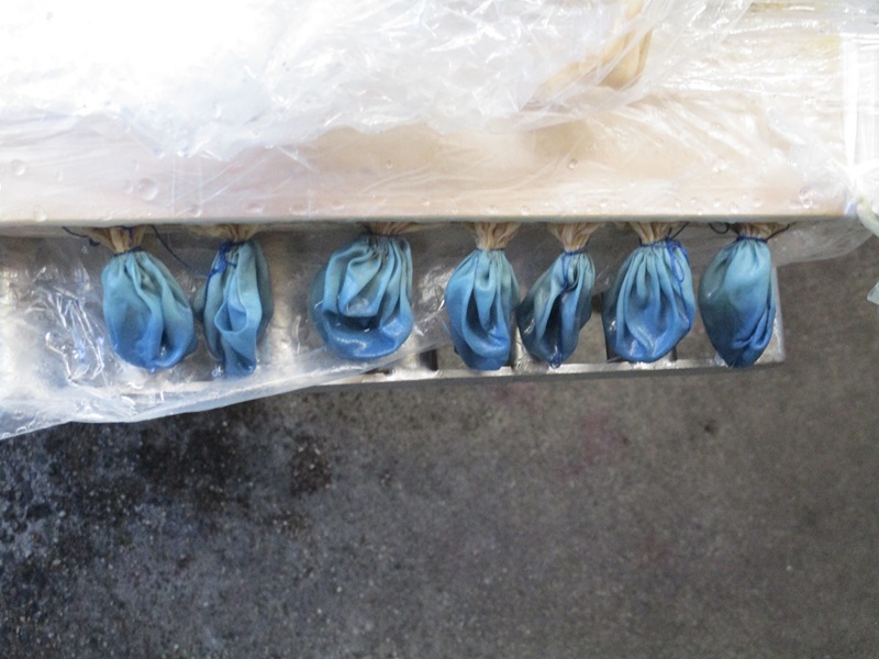次に、水玉の中心部分の濃い水色を染めていきます。このような色がにじむように広がる染め方には「爆弾染め」という技法を使っていきます。爆弾染めには2枚の長方形の板を使い、染める箇所を集めて2枚の板で挟み、固定します。あらかじめ色を合わせた染料の釜に数秒浸し、染まったことを確認して釜から上げます。旧衣装の水玉文様は、中心部から広がるように色がにじんでいます。これに合わせるには、帽子絞りの箇所全体を染料に浸すのではなく、先端部分のみを浸すことになります。染料に浸すこと8秒。緊張して手が震えたそうです。