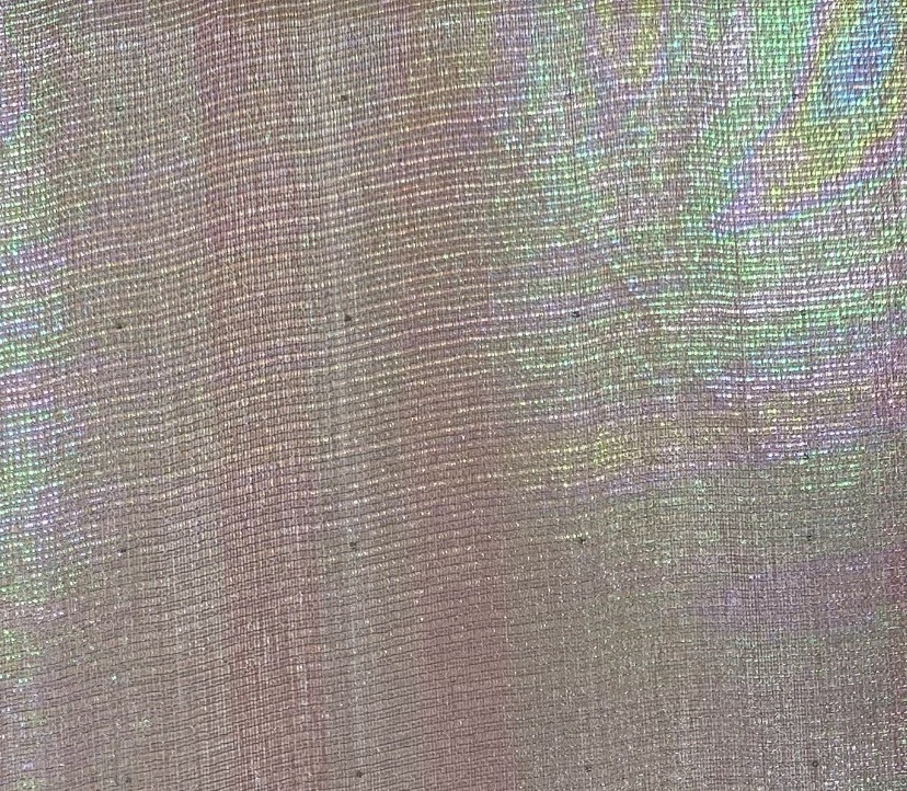 経糸、緯糸に異色の糸を使ったシャンブレー効果とラミネート効果による玉虫調の布地。