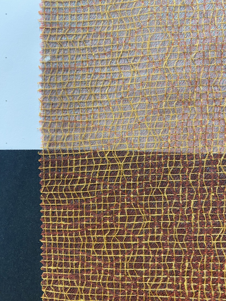 経糸、緯糸に異色の糸を使った綾織に、繊度の異なる糸で格子状のキャンパス模様が表現されたジャカードの布地。